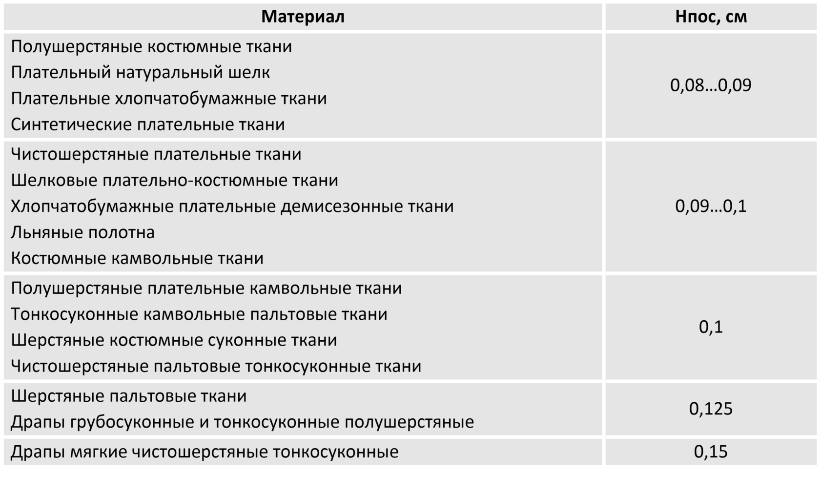 Величина посадки зависит от свойств материала, так в синтетических сухих материалах посадку закладывают минимальную, т.к. данные материалы с трудом поддаются ВТО, а в мягкие чистошерстяные драпы, наоборот - максимальную.